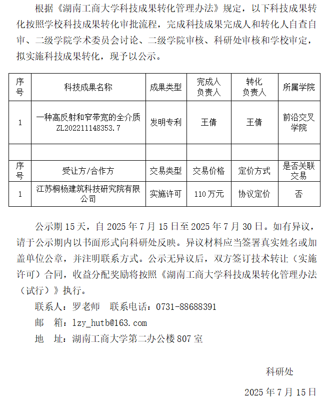 湖南工商大学科技成果转化交易公示(2025R18_0715)
