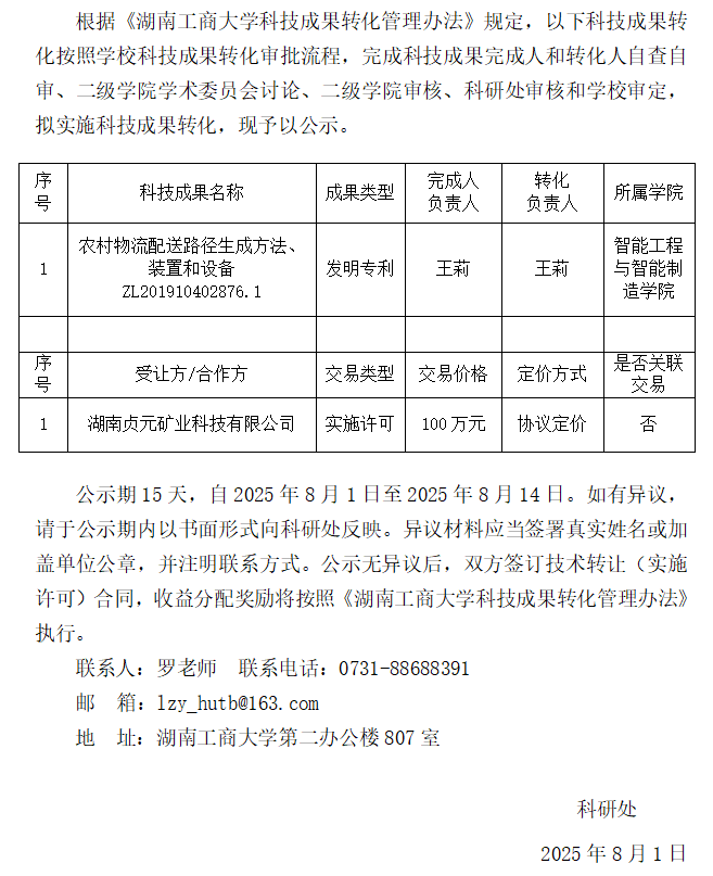 湖南工商大学科技成果转化交易公示(2025R21_0801)