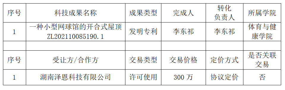 根据《湖南工商大学科技成果转化管理办法(试行)》(校行发[2021]70号)文件规定,以下科技成果转化按照学校科技成果转化审批流程,完成科技成果完成人和转化人自查自审、二级学院学术委员会讨论、二级学院审核、科研处审核和学校审定,拟实施科技成果转化,现予以公示。