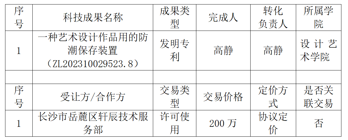 根据《湖南工商大学科技成果转化管理办法(试行)》(校行发[2021]70号)文件规定,以下科技成果转化按照学校科技成果转化审批流程,完成科技成果完成人和转化人自查自审、二级学院学术委员会讨论、二级学院审核、科研处审核和学校审定,拟实施科技成果转化,现予以公示。